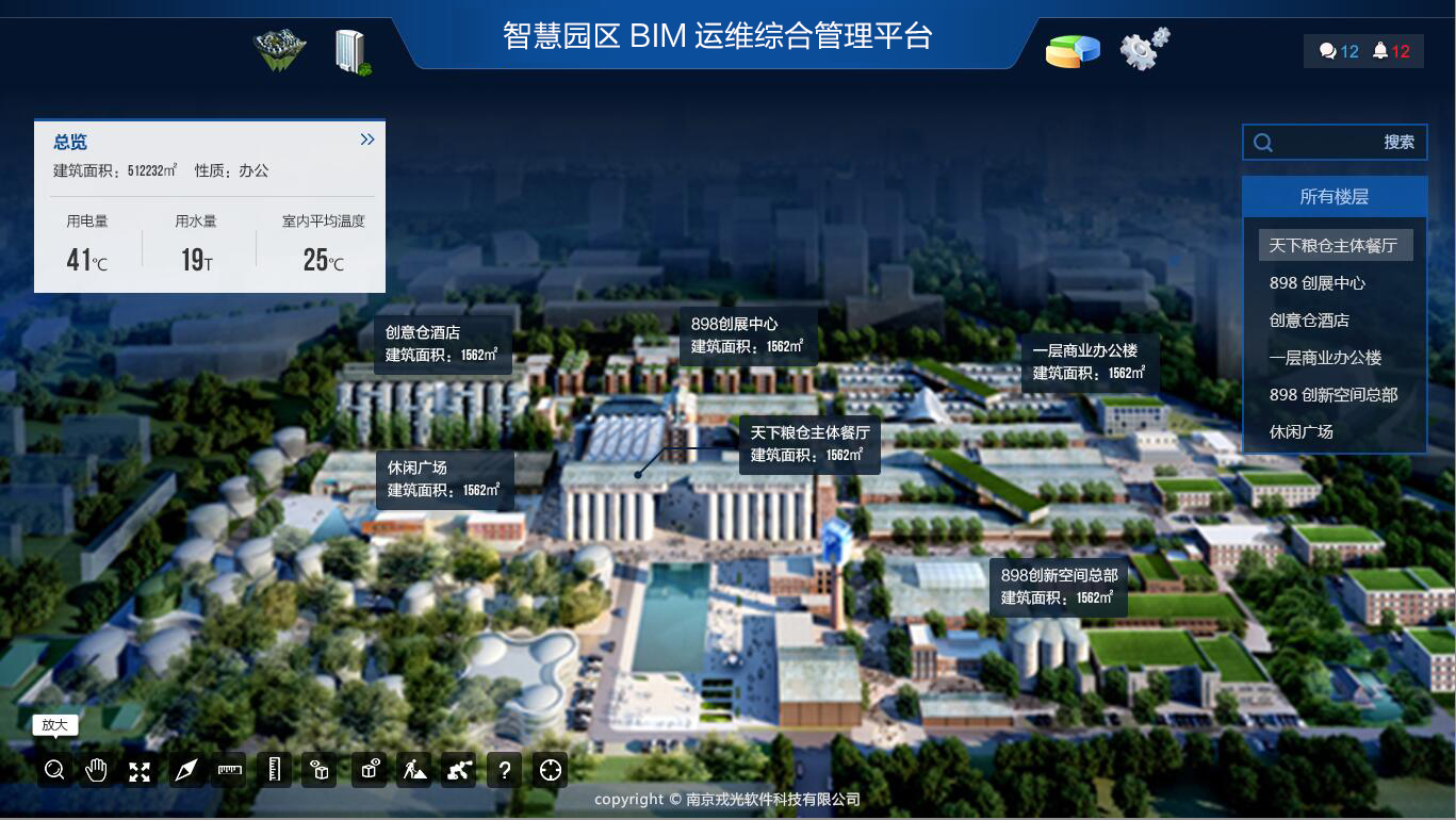 戎光科技基于BIM的智慧园区整体解决方案具备强大的地理信息,可对整个园区进行数字化的虚拟展示,可将园区的设施设备资产、房屋租赁、维修维护管理、园区的安全监控等进行集中的管理,实现各类资源的整合优化配置,全面提升产业园区的服务质量和运行管理水平,深化产业园区的智慧化进程,提供智慧园区的全生命周期服务。