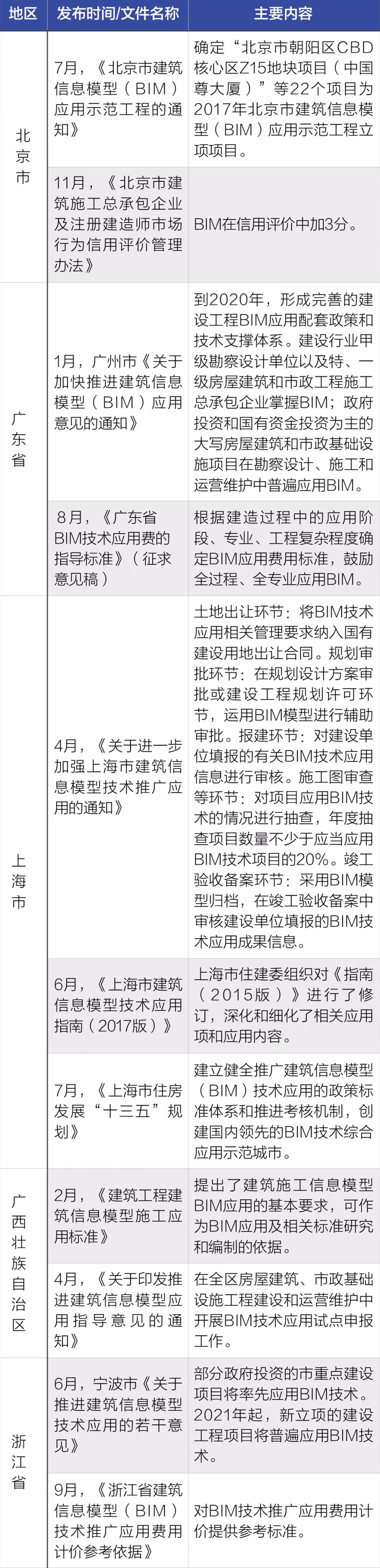 随着国家相关政策出台,全国各省市近几年也纷纷制定相应的标准,对BIM技术在建筑行业中应用进行大力推广和扶持: